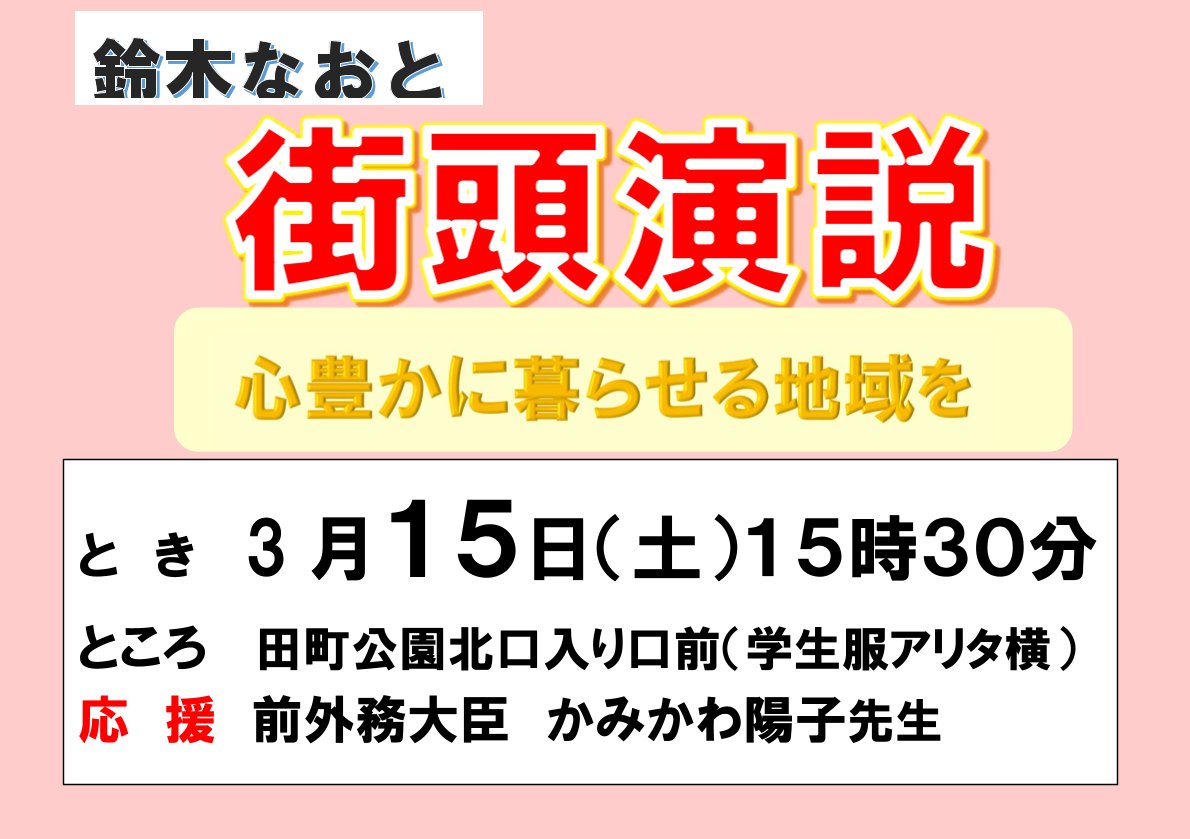 3月15日(土)15時30分田町公園北口入口前で街頭演説があります