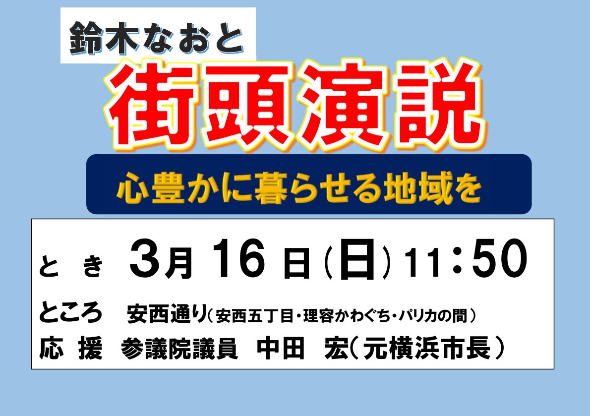 3月16日(日)11時50分安西五丁目で街頭演説があります