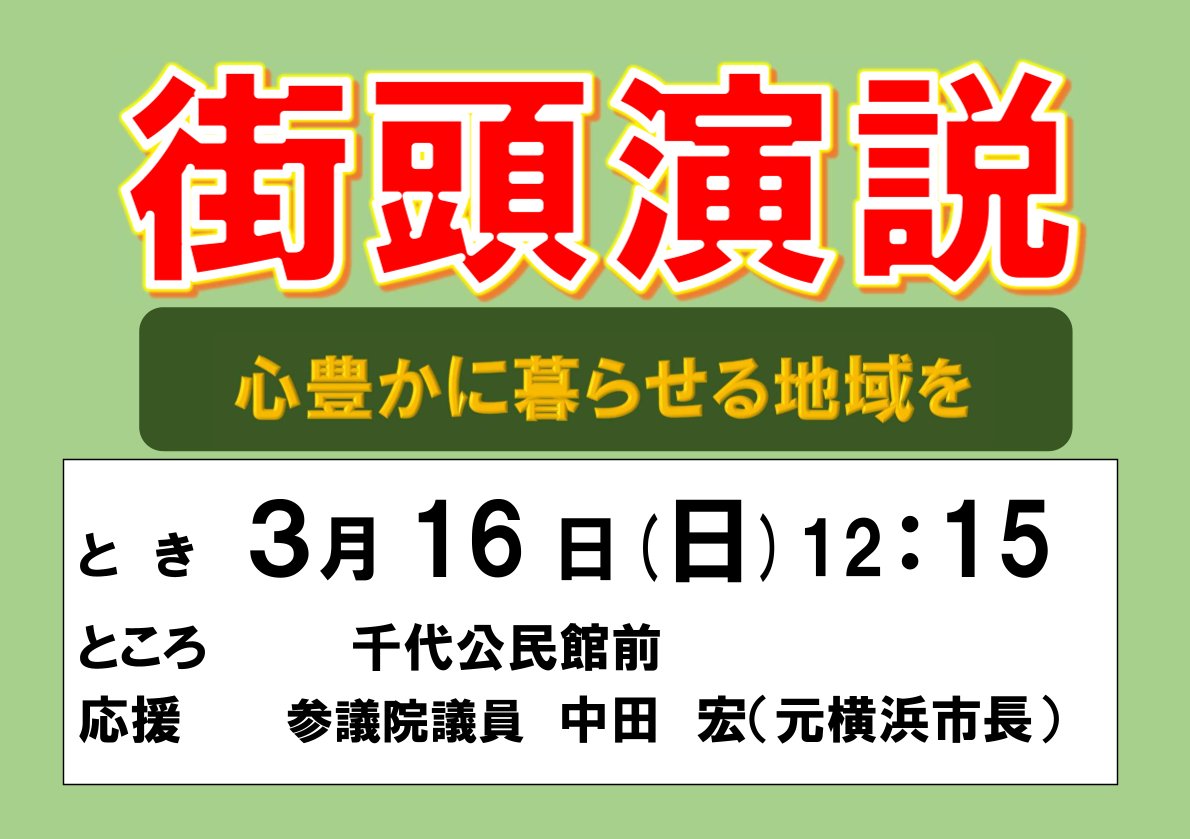 3月16日(日)12時15分千代公民館前で街頭演説があります